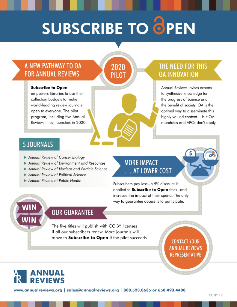 Suscribirse a Open convierte las revistas de acceso limitado en acceso abierto utilizando la suscripción de biblioteca existentes y las compras por suscripción. Las instituciones que ya conocen y valoran el contenido simplemente continúan suscribiéndose (no hay APC ni otros costos adicionales) y mientras se mantengan los ingresos por suscripción, el volumen del año se publicará en acceso abierto y los volúmenes anteriores estarán disponibles gratuitamente. Si los ingresos por suscripción son insuficientes para cubrir los costos, por ejemplo, como resultado de que las instituciones decidan consultar los contenidos gratis, las revistas seguirán teniendo acceso cerrado. Por lo tanto, Subscribe to Open es una oferta de suscripción, pero que permite a las bibliotecas maximizar el impacto de los presupuestos de sus colecciones al respaldar la publicación de acceso abierto de contenido de gran valor.