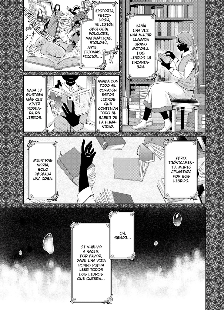 El libro narra la historia de una estudiante universitaria, Urano Motosu, a la que le encantan los libros desde que era pequeña muere en un accidente, muere aplastada por un gran número de libros, y resucita en un mundo completamente distinto del que no sabe nada en absoluto. Ahora es Myne, la enfermiza hija de cinco años de un pobre soldado. Las personas de ese mundo apenas saben leer y los libros prácticamente son inexistentes, además de muy caros. Así que Myne decide convertirse en bibliotecaria para vivir rodeada de libros para siempre. Sin duda, esta es una historia dulce que hará las delicias de los amantes de la lectura y de los ratones de biblioteca.