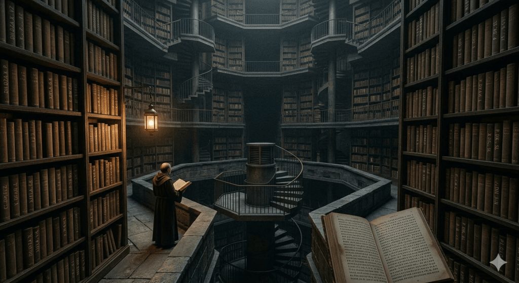 “La biblioteca existe desde la eternidad. Esto significa que tanto la biblioteca de Babel como los bibliotecarios pueden ser obra de un dios o del azar. El número de símbolos ortográficos usados en los libros es de veinticinco, incluyendo el espacio, la coma y el punto. Los libros de Babel están compuestos a partir de combinaciones aleatorias de estos signos, agotando todas las posibles combinaciones (cuyo número es inimaginablemente grande, pero no infinito). Esto demuestra la naturaleza caótica e informe de todos los libros. Por cada palabra que esté escrita, puede haber palabras inconexas, frases incoherentes, que forman lenguas menos incoherentes.»