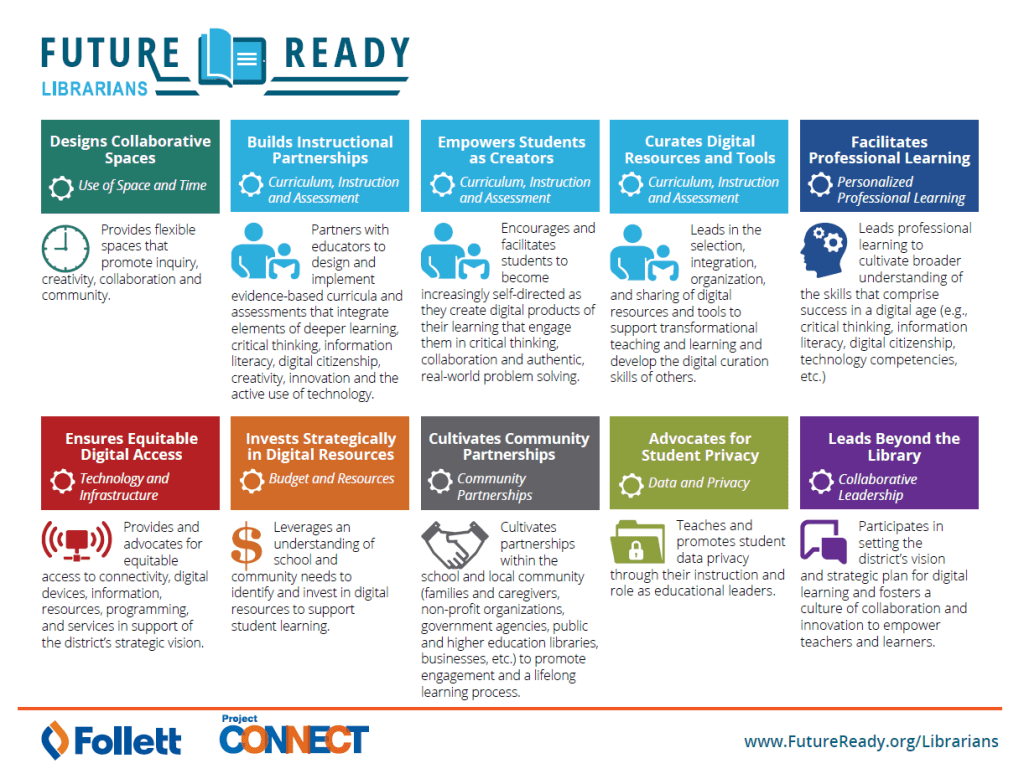 Derivados del del marco de las Future Ready Schools® (FRS), estos principios describen cómo los bibliotecarios pueden apoyar a las escuelas en esta transición e identifican formas específicas de que los bibliotecarios puedan estar más preparados para el futuro. Al alinearse con iniciativas estratégicas como FRS, los bibliotecarios pueden conectar mejor sus prácticas, programas y espacios con la innovación educativa en las escuelas. Si se preparan y apoyan adecuadamente, los bibliotecarios escolares están bien posicionados para estar a la vanguardia de la transformación digital del aprendizaje.