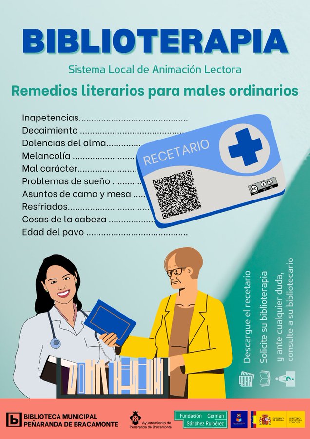 El programa «Lectura para la salud, salud lectora», diseñado por la Fundación Germán Sánchez Ruipérez (FGSR) y la Biblioteca Municipal. Así el equipo de la Biblioteca Municipal de Peñaranda ha preparado un talonario de recetas que se asemejan a las que expide un médico. Estas recetas recogen una serie de dolencias y sugieren los libros más adecuados para combatir el malestar que aqueje al lector en ese momento. Cada receta incluye al menos dos obras literarias, todas ellas disponibles en formato físico en la biblioteca, aunque en algunos casos también se podrán descargar a través de un código QR que aparece en las cajas de medicamentos, a modo de prospecto.