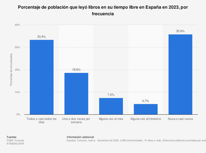 La encuesta realizada entre marzo y diciembre de 2023 proporciona una visión reveladora sobre los hábitos de lectura de los españoles durante su tiempo libre. Según los resultados, aproximadamente el 33,5% de los encuestados afirmaron que leían libros todos o casi todos los días. Aunque esta cifra sugiere una parte considerable de la población que lee de manera frecuente, es importante destacar que aún existe una proporción mayor de personas que declararon no leer libros regularmente. Esta estadística indica que, a pesar de la presencia de un segmento significativo de lectores habituales, hay una necesidad de fomentar y promover la lectura en la sociedad española para aumentar la participación y el disfrute de esta actividad en el tiempo libre de una parte más amplia de la población.