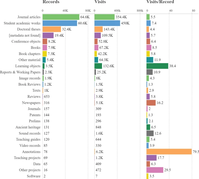 Los resultados revelan que muchos registros en estos repositorios no aparecen en los primeros puestos de los resultados de búsqueda de Google. Los registros más visibles suelen ser trabajos académicos (tesis y disertaciones) en español, particularmente en Humanidades y Ciencias Sociales. Sin embargo, la mayoría de las visitas provienen de un número reducido de registros. Estos hallazgos cuestionan el papel de los IR en atraer lectores a través de Google Search, destacando que su enfoque principal sigue siendo la preservación más que la difusión en línea.