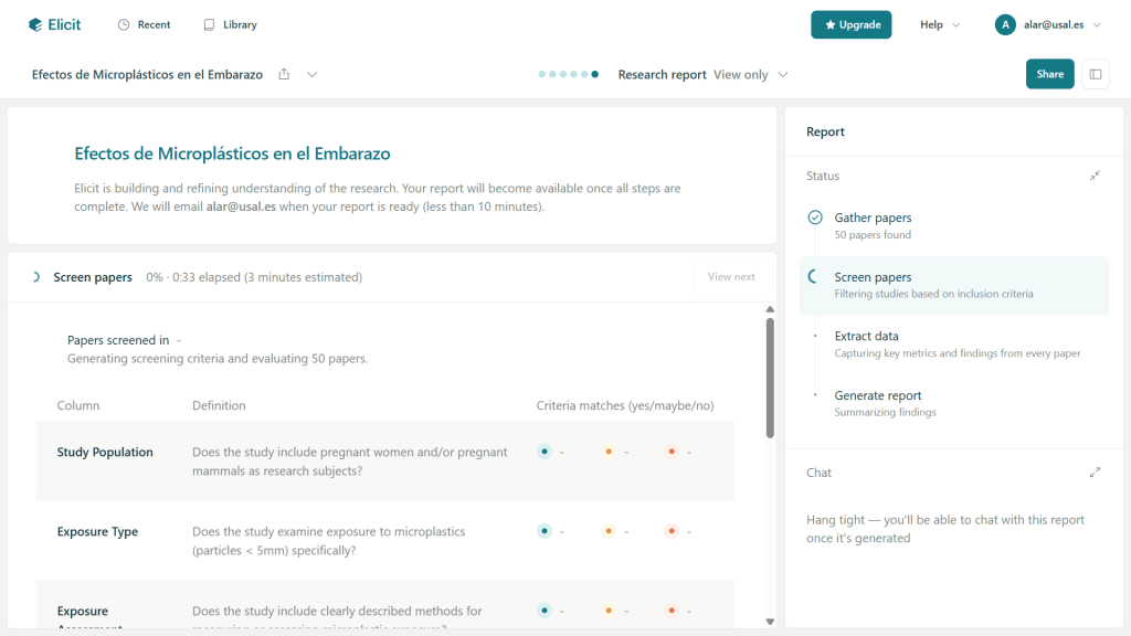El funcionamiento de Elicit Reports comienza con la formulación de una pregunta de investigación, que la herramienta ayuda a aclarar y enfocar, sugiriendo posibles ángulos de análisis. A partir de ahí, realiza de manera automática una revisión rápida que incluye la búsqueda, selección y extracción de datos para generar el informe. Durante el proceso, permite al usuario revisar y modificar cada etapa, desde los estudios incluidos hasta los resúmenes elaborados. Cada afirmación del informe se respalda con citas textuales exactas de las fuentes originales, lo que facilita la verificación de la información. Además, ofrece la posibilidad de interactuar con el informe a través de un chat, desde el que se pueden ampliar datos, resolver dudas concretas o solicitar resúmenes adicionales.