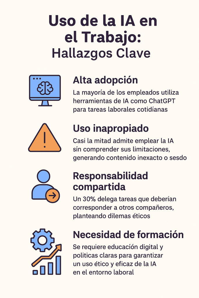A pesar de su popularidad, casi la mitad de los encuestados admite utilizar la IA de manera inapropiada. Muchos no comprenden completamente cómo funcionan estas herramientas ni sus limitaciones, lo que puede derivar en la producción de contenido inexacto, sesgado o incluso plagio involuntario. Además, el estudio señala que alrededor del 30 % de los participantes ha delegado en la IA tareas que originalmente correspondían a otros colegas, generando conflictos de responsabilidad y cuestionamientos éticos en el lugar de trabajo. Los investigadores enfatizan que estas prácticas pueden afectar tanto la productividad como la confianza dentro de los equipos.