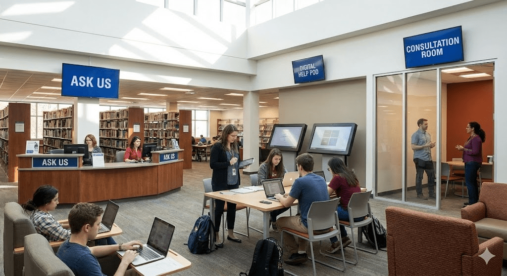 El valor de la asistencia presencial A pesar de la narrativa común sobre el declive de los servicios tradicionales, el estudio revela que persiste un valor considerable en la asistencia de investigación cara a cara y en el «punto de necesidad». Los profesionales entrevistados sostienen que el contacto directo con un bibliotecario o personal especializado sigue siendo fundamental para resolver consultas de investigación profundas, permitiendo una interacción que a menudo no se replica con la misma eficacia en los canales digitales. Sin embargo, se reconoce que el volumen de consultas en los mostradores físicos ha disminuido, lo que obliga a repensar su función.