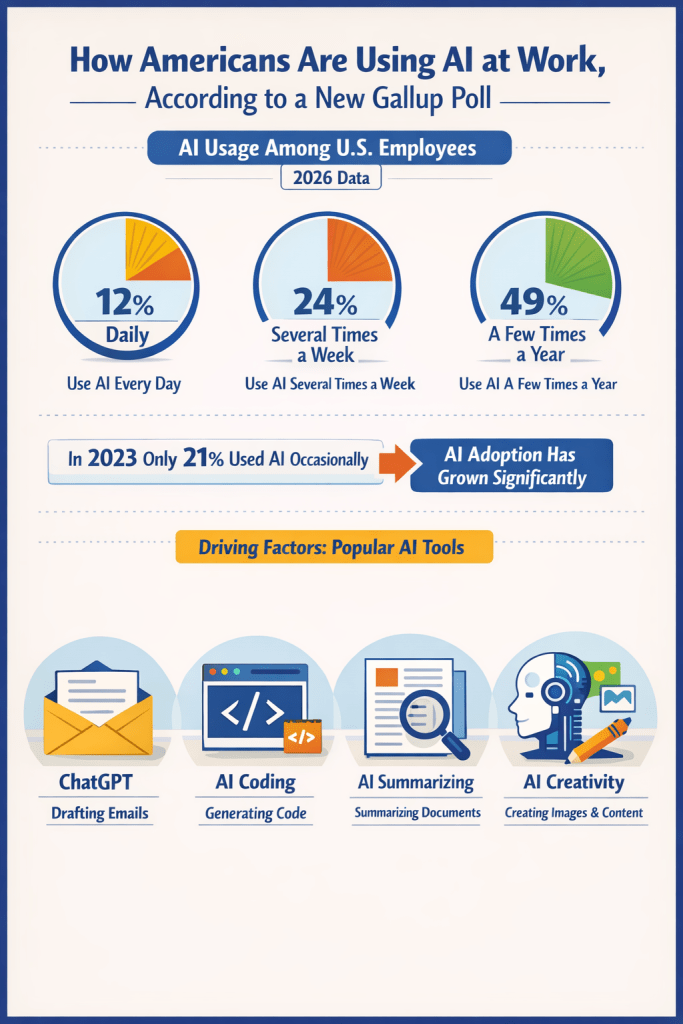Una encuesta nacional de Gallup realizada en otoño de 2025 entre más de 22 000 trabajadores de Estados Unidos muestra que el uso de inteligencia artificial (IA) en el lugar de trabajo ha crecido rápidamente en los últimos años.