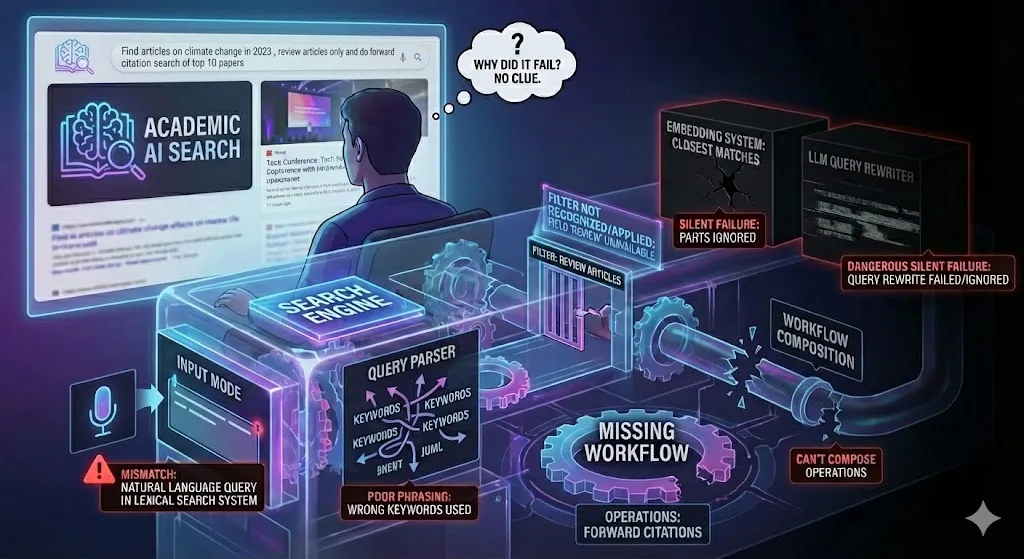En la era previa a la inteligencia artificial, muchas plataformas de búsqueda ofrecían herramientas como operadores booleanos, menús desplegables y categorías que ayudaban a los usuarios a acotar y precisar sus consultas. Estas herramientas, aunque a veces complejas, proporcionaban un marco de referencia sobre cómo interactuar con la base de datos o motor de búsqueda. Sin embargo, las interfaces modernas con IA, como los chatbots y asistentes inteligentes, presentan una única caja de texto sin indicaciones claras sobre qué esperar. Esto crea dos niveles de ambigüedad para el usuario: por un lado, no está seguro de cómo debe redactar su consulta —si debe usar términos técnicos, lenguaje natural, frases completas, comandos específicos o prompts diseñados para la IA—, y por otro lado, desconoce qué tipo de capacidades tiene el sistema, qué preguntas puede responder con precisión y cuáles no. Esta doble incertidumbre dificulta la confianza en el sistema y genera una sensación de trial and error constante, en la que los usuarios prueban diferentes formas de preguntar sin saber cuál será la mejor.