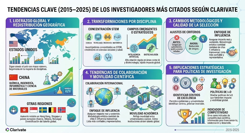 Entre 2015 y 2025, el programa de Highly Cited Researchers (Investigadores Altamente Citados) de Clarivate Analytics, gestionado por el Institute for Scientific Information (ISI), ha registrado una década de transformaciones y patrones significativos en la producción científica global.
