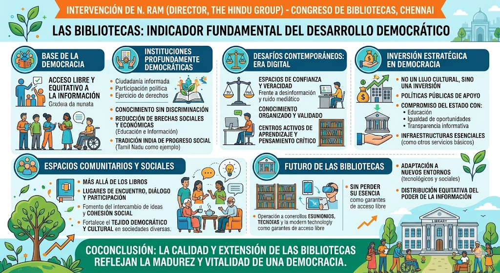 El artículo recoge la intervención de N. Ram, en el marco del Congreso de Bibliotecas celebrado en Chennai, donde defiende una idea central: las bibliotecas son un indicador fundamental del desarrollo democrático de una sociedad. Su argumento parte de que el acceso libre y equitativo a la información constituye una base imprescindible para la ciudadanía informada, la participación política y el ejercicio de derechos.