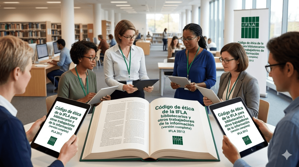 El Código de Ética de la IFLA establece los principios que deben guiar la labor de bibliotecarios y profesionales de la información, destacando el acceso libre, equitativo y sin censura a la información; la defensa de la libertad intelectual; el respeto a la diversidad cultural y social; la protección de la privacidad y confidencialidad de los usuarios; el equilibrio entre acceso al conocimiento y derechos de autor; y el ejercicio profesional con integridad, imparcialidad y responsabilidad social, promoviendo la cooperación, el respeto entre colegas y el compromiso con el desarrollo continuo.