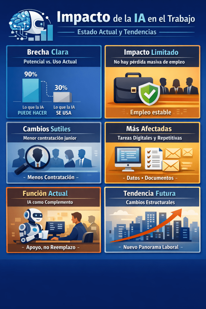 - Impacto limitado: no hay destrucción masiva de empleo por ahora.