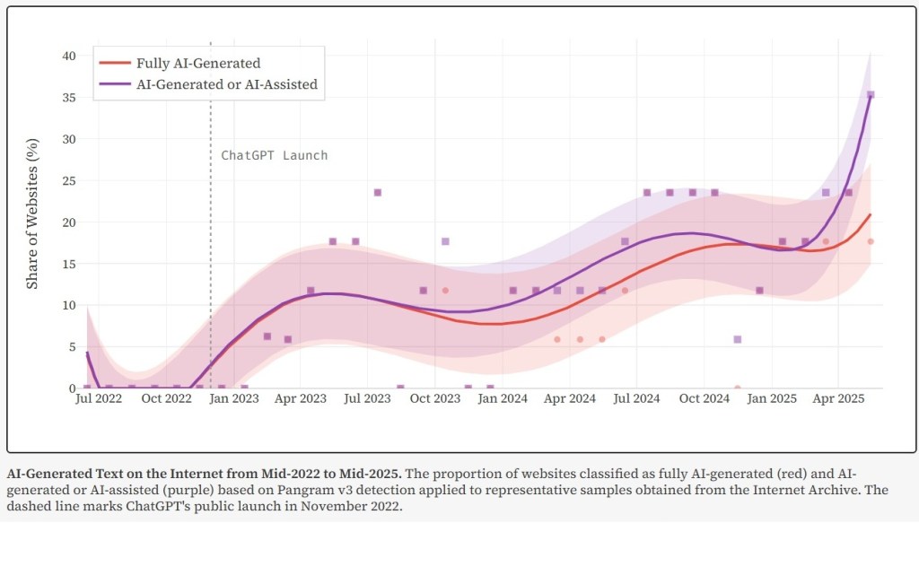 El estudio analiza cómo la rápida expansión del texto generado por inteligencia artificial ha transformado el ecosistema digital entre 2022 y 2025. A partir de una muestra representativa de páginas web obtenida mediante la Wayback Machine del Internet Archive, los autores estiman que hacia mediados de 2025 aproximadamente el 35 % de los nuevos sitios web contienen texto generado o asistido por IA, una cifra que contrasta con la inexistencia de este fenómeno antes del lanzamiento de ChatGPT en 2022. Este crecimiento evidencia la velocidad con la que la IA se ha integrado en la producción de contenidos en línea.