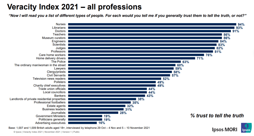 Las últimas encuestas de Veracity Index situaron a los bibliotecarios como una de las profesiones más confiables del Reino Unido, tradicionalmente muy arriba en la escala de confianza — incluso en el top 3 en ediciones previas.