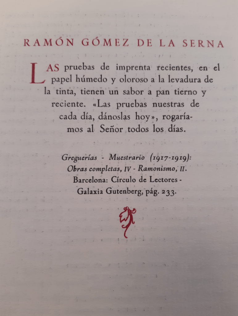 Las pruebas de imprenta recientes, en el papel húmedo y oloroso a la levadura de la tinta, tienen un sabor a pan tierno y reciente. «Las pruebas nuestras de cada día, dánoslas hoy,» rogaríamos al Señor todos los días”