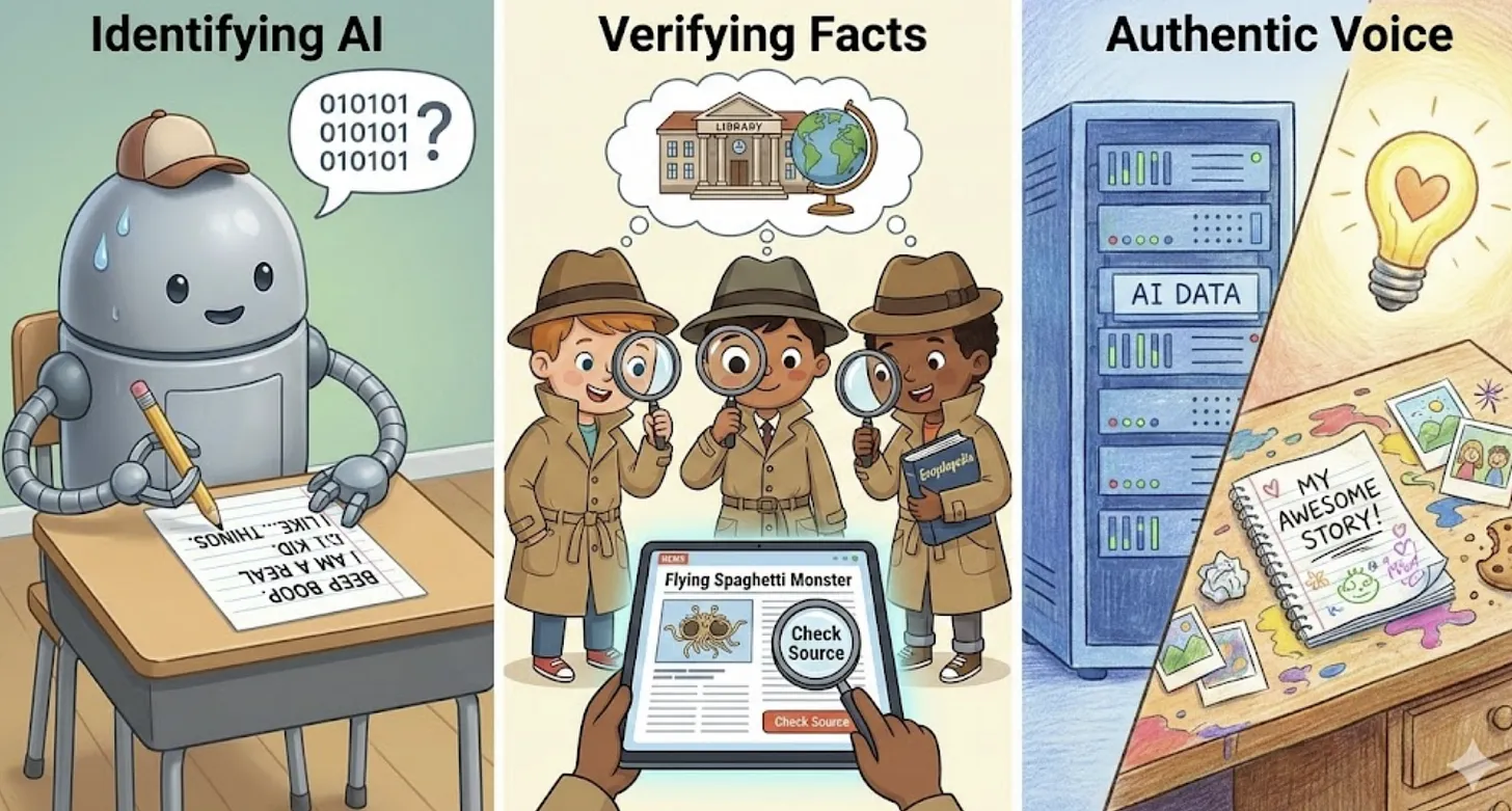 Otro aspecto fundamental es el reconocimiento de la voz del texto. Los niños aprenden a diferenciar entre escritura humana y textos generados por IA, identificando rasgos como estilo, coherencia, singularidad o detalles personales que a menudo faltan en los textos automatizados. Esta habilidad les permite detectar cuándo un texto es genérico, neutro o artificial, y fomentar su pensamiento crítico.