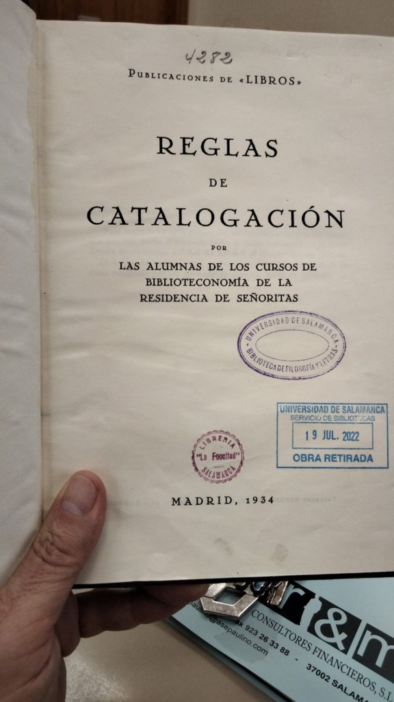 Reglas de catalogación para las alumnas de los cursos de Biblioteconomía de la Residencia de Señoritas. Madrid: Talleres Espasa – Calpe, 1934. 25,5 cm. 104 p.